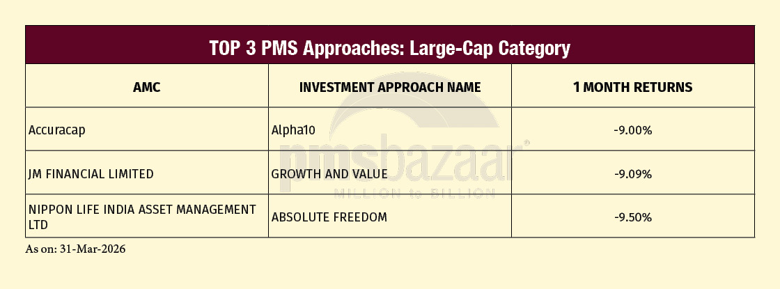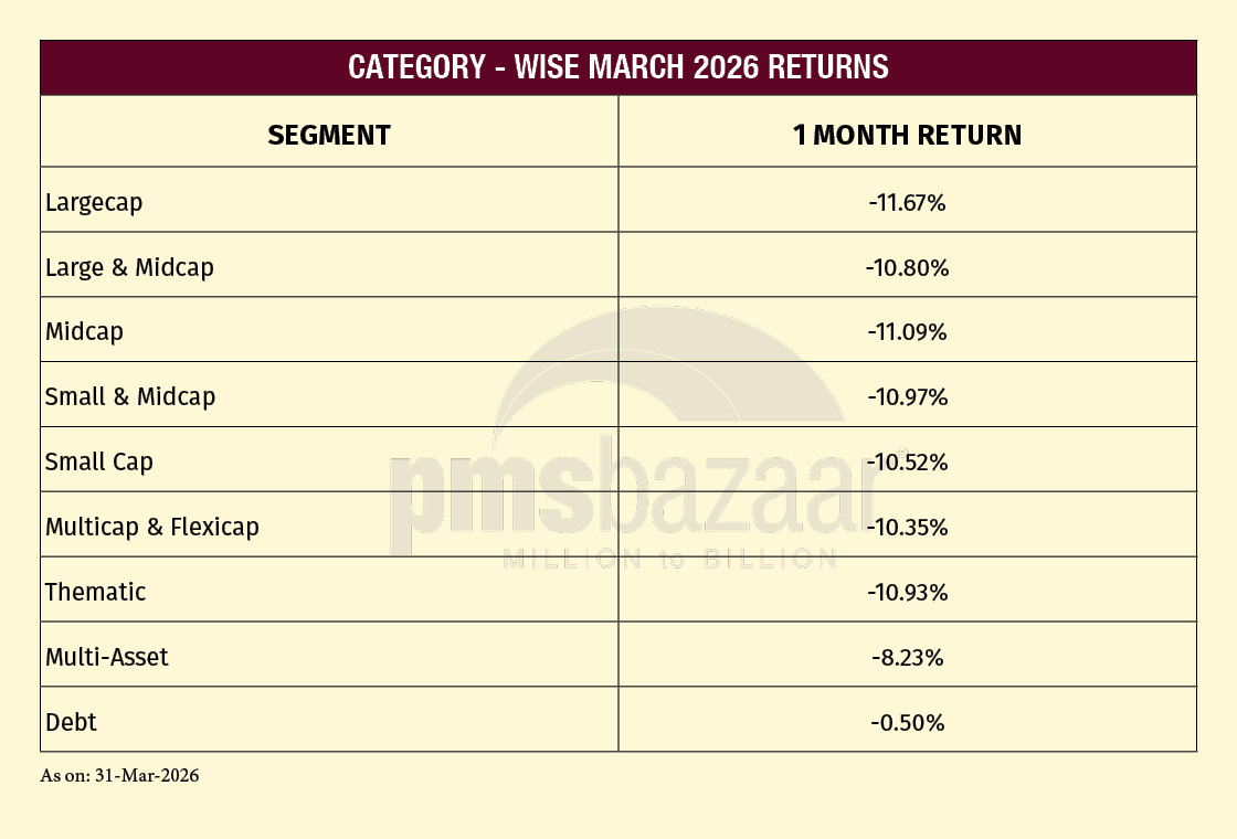 Amid the US/Israel-Iran war, March 2026 was one of the toughest months in recent years for PMS investors, with the market extending its decline for a fourth straight month. Foreign institutional investors continued to sell aggressively even as domestic inflows touched record highs. Weakness was broad-based: 46 of the 50 Nifty stocks ended lower during the month, while PSU Banks fell 20 per cent, Real Estate 17 per cent, Private Banks and Automobiles 16 per cent each, and Financials 14 per cent.