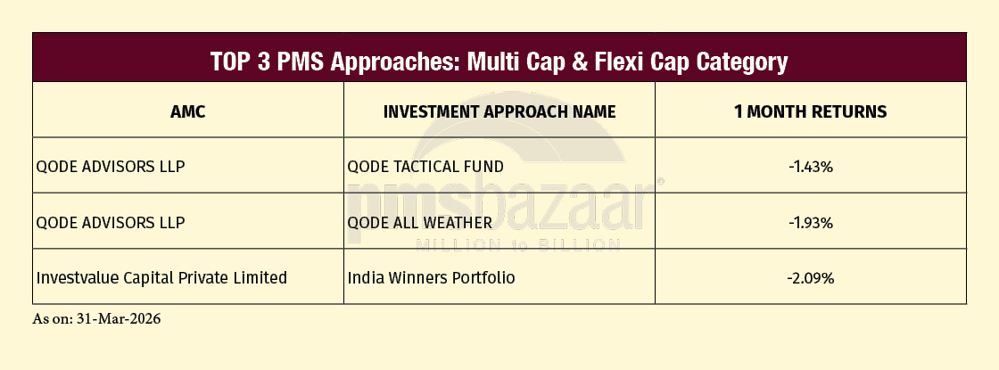That combination of scale and resilience makes this category particularly important. As the largest PMS segment by number of schemes, Multi & Flexicap performance offers the clearest picture of how active equity managers handled March’s fourth straight monthly market decline. The results suggest that flexibility across market-cap buckets and styles helped many managers cushion the sell-off better than more rigid mandates.