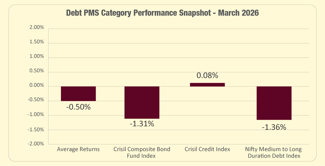 Debt PMSes were by far the most resilient category in March 2026. Across 17 schemes, the average return stood at minus 0.50 per cent, a far smaller decline than any equity or multi-asset PMS segment. The category also compared well against most of its relevant benchmarks. Fourteen schemes outperformed the CRISIL Composite Bond Fund Index, which fell 1.31 per cent, and an equal number beat the Nifty Medium to Long Duration Debt Index, which declined 1.36 per cent. Against the CRISIL Credit Index, which rose 0.08 per cent, 11 schemes managed to do better.