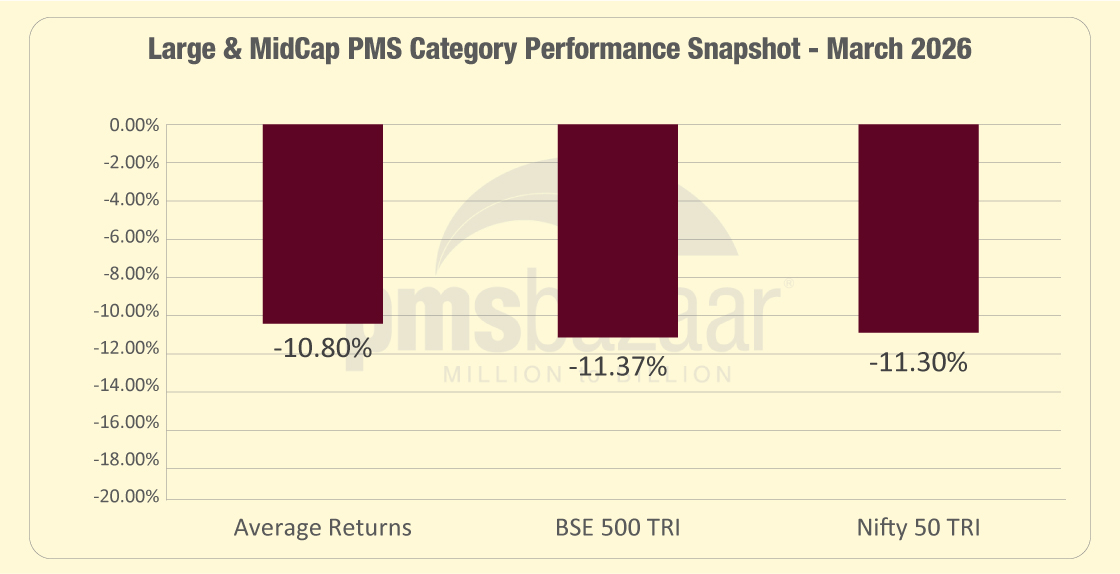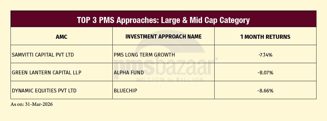 Large & Midcap PMSes were among the better-performing equity categories in March 2026. Across 24 schemes, the average decline stood at 10.80 per cent, lower than both the S&P BSE 500 TRI’s 11.37 per cent fall and the Nifty 50 TRI’s 11.30 per cent decline. Fifteen schemes outperformed each of the two benchmarks, suggesting that the category’s blend of large-cap stability and selective mid-cap exposure helped cushion the market correction.