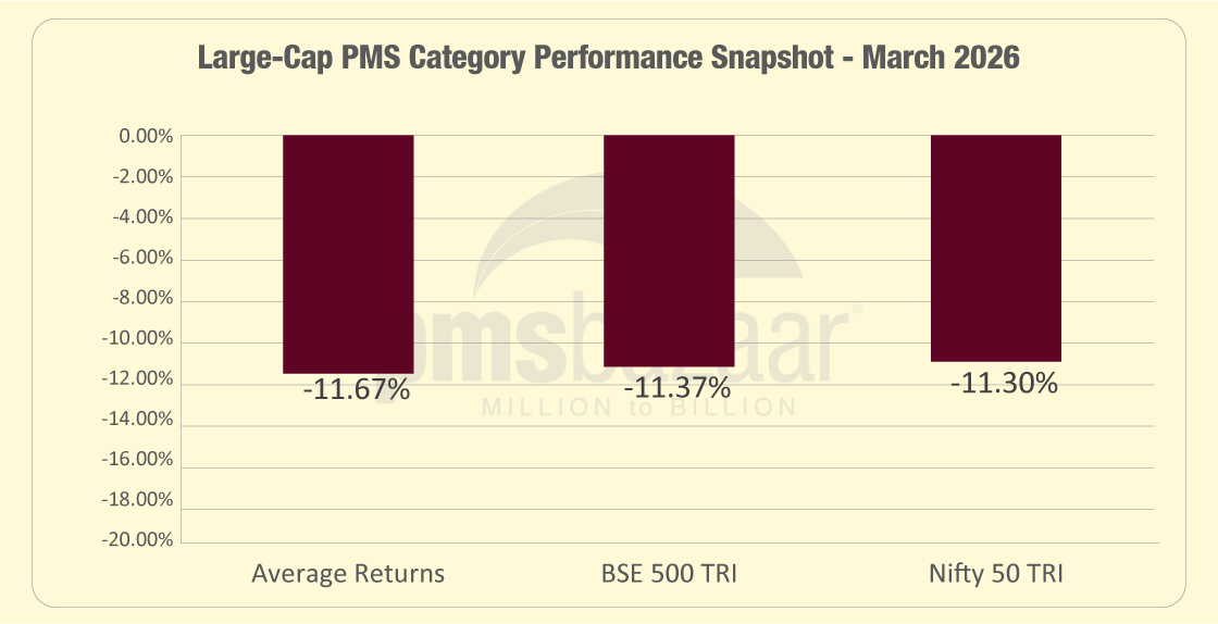Large-cap PMSes were the weakest-performing equity category in March 2026. Across 33 schemes, the average decline stood at 11.67 per cent, marginally worse than both the S&P BSE 500 TRI’s 11.37 per cent fall and the Nifty 50 TRI’s 11.30 per cent decline. Only 11 schemes managed to outperform each of the two benchmarks, indicating that the category struggled to provide the downside protection investors typically expect from large-cap strategies.