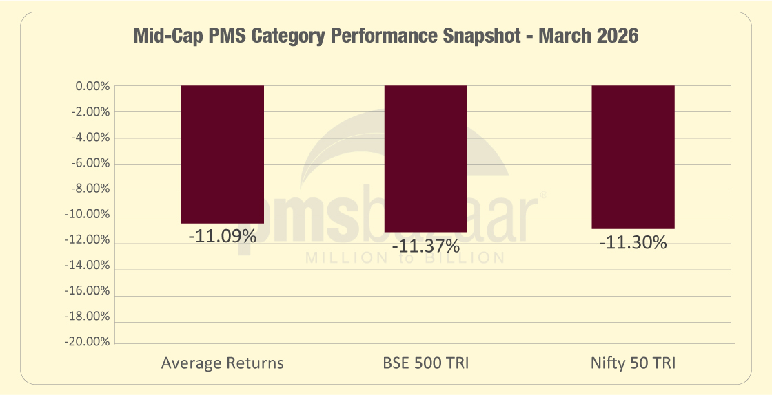 Mid-cap PMSes fared slightly better than the broader market in March 2026, though the category still suffered a sharp correction. Across 23 schemes, the average decline was 11.09 per cent, marginally lower than the S&P BSE 500 TRI’s 11.37 per cent fall and the Nifty 50 TRI’s 11.30 per cent decline. Twelve schemes managed to outperform each benchmark, indicating that manager selection remained important even in a difficult month.