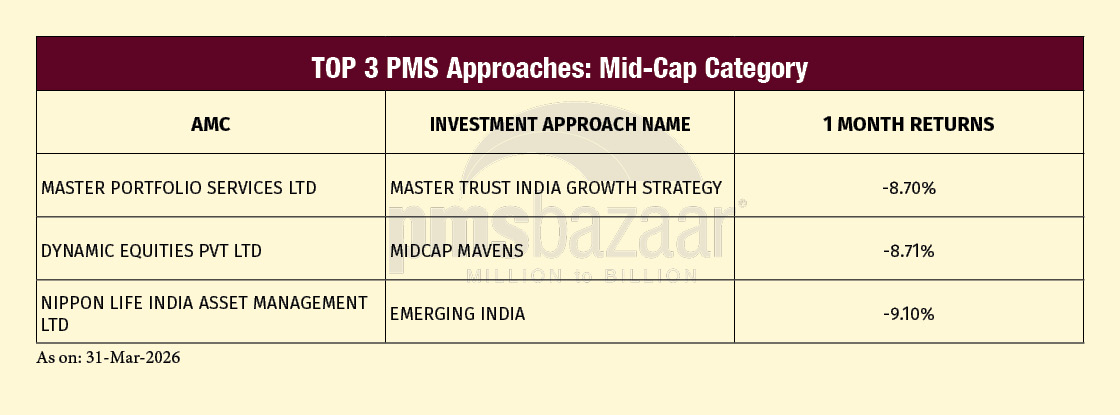 That suggests the category offered some scope for downside protection, but not enough to fully escape the broad-based correction. Compared with Large & Midcap and Multicap PMSes, the room for differentiation within mid-cap portfolios appears to have been narrower.