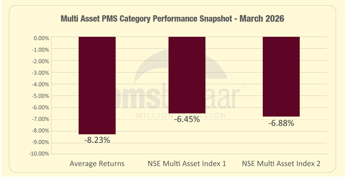 Multi-asset PMSes were clearly more resilient than equity PMSes in March 2026, but the category still underperformed its own reference indices on average. Across 36 schemes, the average decline stood at 8.23 per cent, much lower than the double-digit fall seen in most equity PMS categories. However, that was still worse than the NSE Multi Asset Index 1’s 6.45 per cent decline and the NSE Multi Asset Index 2’s 6.88 per cent fall. Only 10 schemes beat Index 1, while 12 outperformed Index 2.