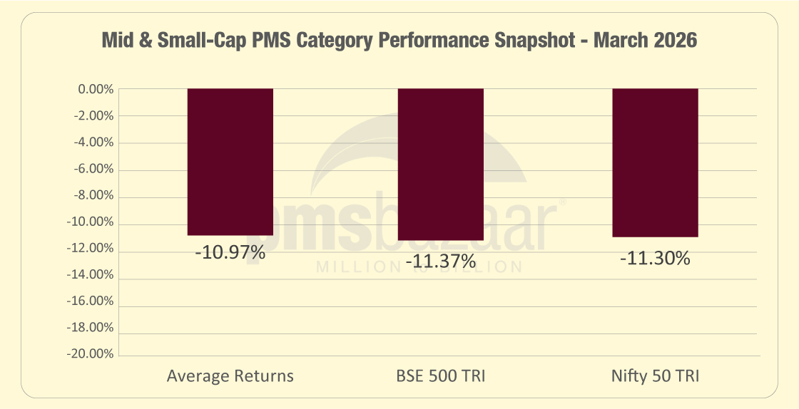 Mid & Small-cap PMSes delivered a better-than-benchmark performance in March 2026, though the category remained deep in negative territory. Across 58 schemes, the average decline stood at 10.97 per cent, lower than both the S&P BSE 500 TRI’s 11.37 per cent fall and the Nifty 50 TRI’s 11.30 per cent decline. Thirty-three schemes beat the BSE 500 TRI, while 32 outperformed the Nifty 50 TRI, indicating that more than half the category managed to preserve capital better than the benchmarks.
