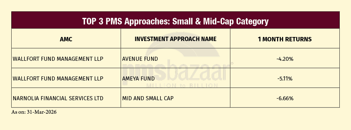 That suggests this segment offered greater scope for managers to add value than large-cap or mid-cap PMSes, but also carried a higher penalty for getting the positioning wrong. March therefore reinforced a familiar pattern: in Mid & Small-cap PMSes, manager selection matters far more than category exposure alone.