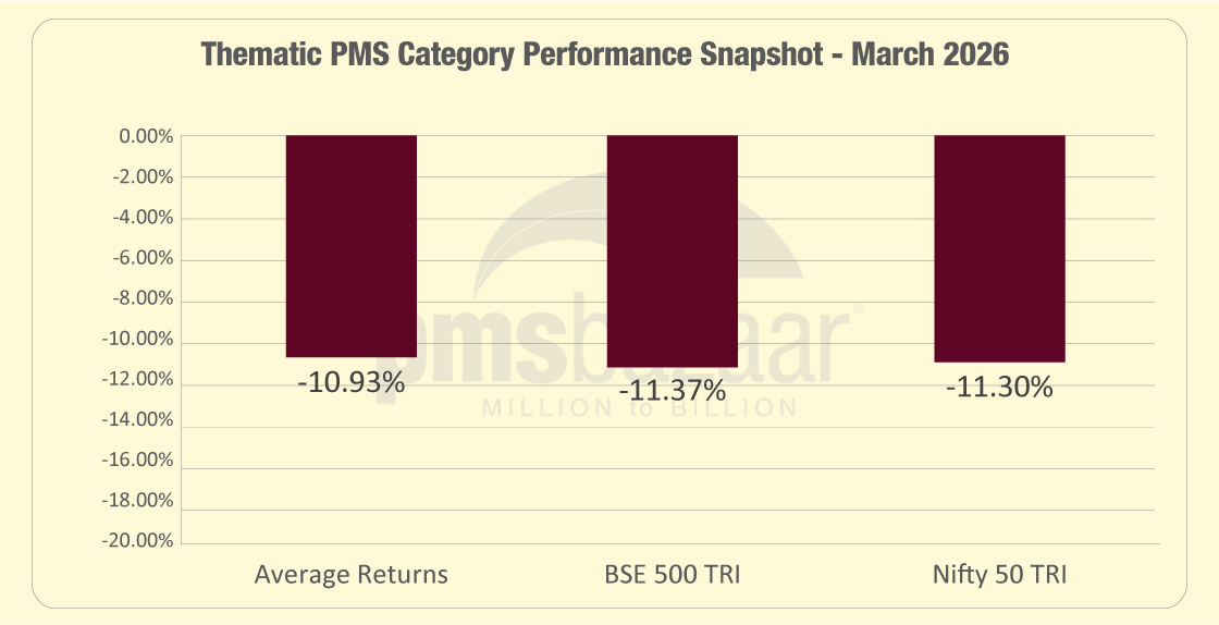 Thematic PMSes held up slightly better than the broader market in March 2026, though the category still posted a steep average decline of 10.93 per cent. Across 21 schemes, 13 outperformed the S&P BSE 500 TRI and an equal number beat the Nifty 50 TRI, suggesting that a majority of managers were able to protect capital somewhat better than the benchmarks despite the difficult market backdrop.