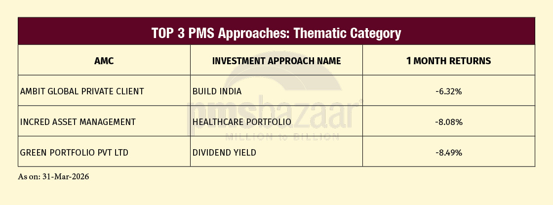 Ambit Global Private Client’s Build India was the best-performing thematic PMS, declining 6.32 per cent. InCred Asset Management’s Healthcare Portfolio followed with an 8.08 per cent fall, while Green Portfolio’s Dividend Yield strategy was down 8.49 per cent. That underlines the core feature of thematic PMS investing: it can produce differentiated outcomes, but it offers less margin for error than broader diversified mandates. In March, thematic strategies neither collapsed nor excelled as a group; instead, they once again proved highly dependent on the relevance of the chosen theme.