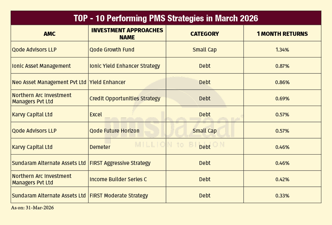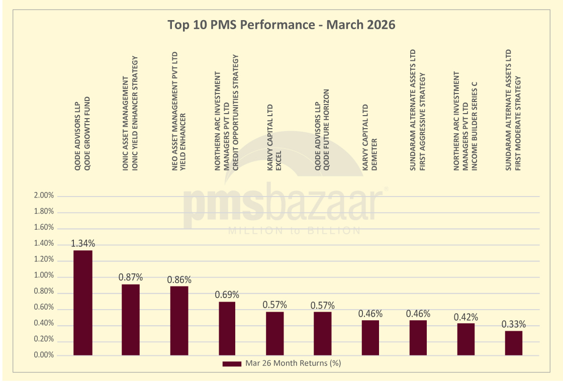 March’s overall top-10 PMS list, across all asset classes, was dominated by debt strategies as fixed-income portfolios proved far more resilient than equities during the market sell-off. Of the 10 best-performing PMSes in March, seven were debt schemes. Ionic Asset Management’s Ionic Yield Enhancer Strategy ranked second overall with a 0.87 per cent return, followed closely by Neo Asset Management’s Yield Enhancer at 0.86 per cent and Northern Arc’s Credit Opportunities Strategy at 0.69 per cent. Karvy Capital’s Excel and Demeter, Sundaram Alternate Assets’ FIRST Aggressive and FIRST Moderate strategies, and Northern Arc’s Income Builder Series C also featured in the top 10. The only equity PMSes to post gains were Qode Advisors’ Qode Growth Fund and Qode Future Horizon, while Value Prolific’s Conserve C ended flat. The composition of the list underlines how sharply March favoured capital preservation over return-seeking. With equity markets down more than 11 per cent, debt PMSes emerged as the month’s clear relative winners.