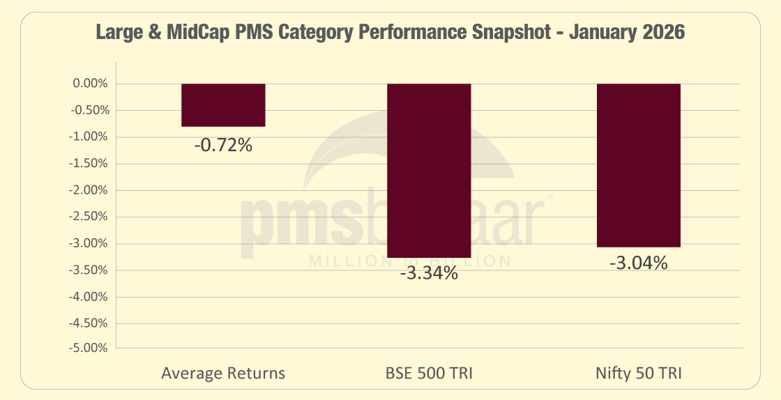 Large & Midcap PMS strategies were the most resilient among equity buckets in January 2026, limiting losses even as the broader market corrected. Across 24 schemes tracked, the category delivered an average return of -0.72%, a markedly smaller drawdown than the S&P BSE 500 TRI (-3.34%) and the Nifty 50 TRI (-3.04%).