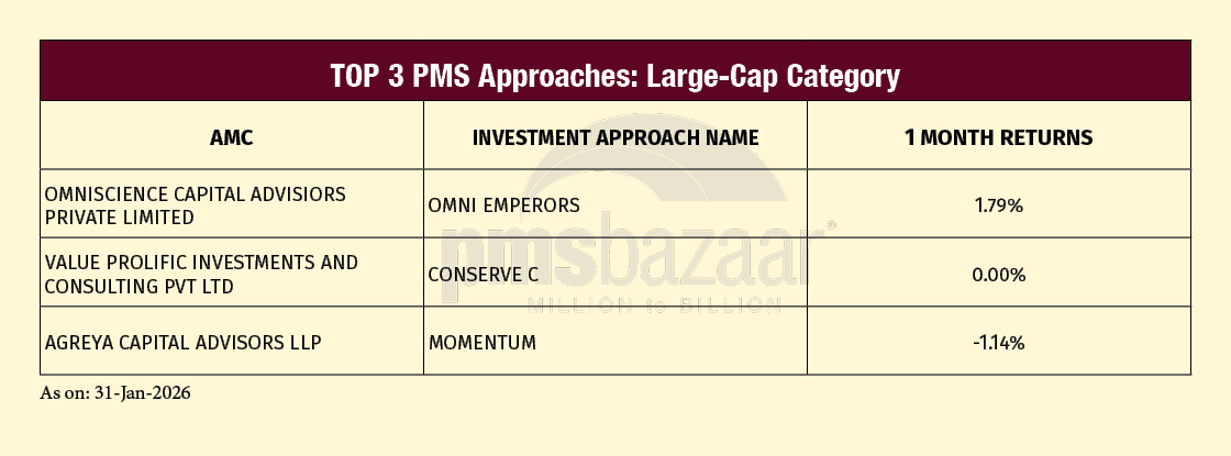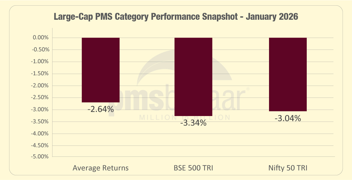 Large-cap PMS strategies tracked the market’s risk-off tone in January 2026, but still managed relative resilience versus the broader indices. Across 31 schemes tracked, the category delivered an average return of -2.64%, which was better than the S&P BSE 500 TRI (-3.34%) and also ahead of the Nifty 50 TRI (-3.04%).