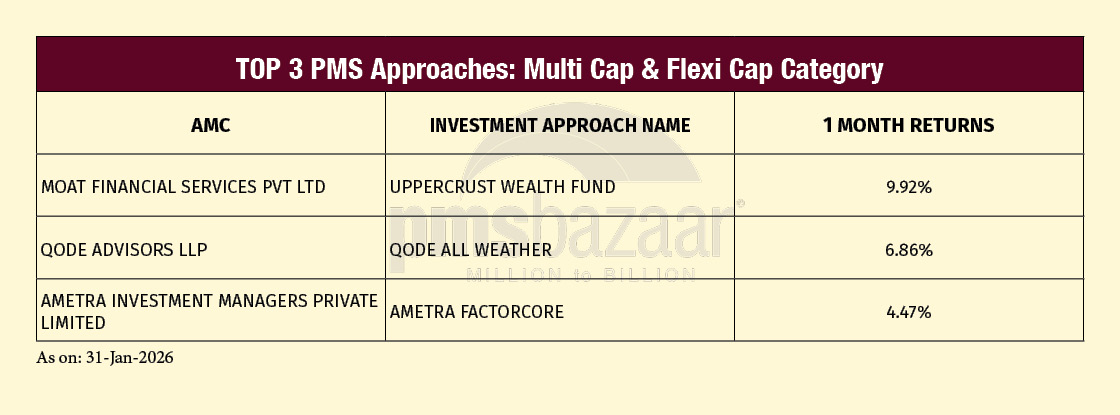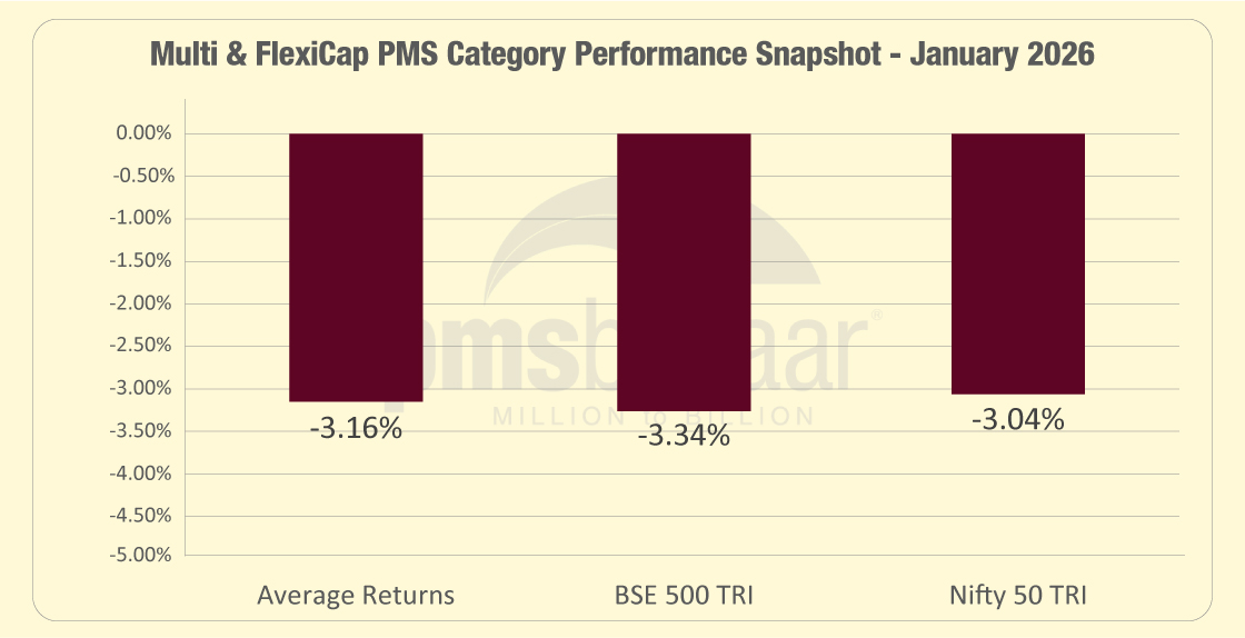 Multi & Flexicap PMS strategies formed the largest bucket in the January 2026 snapshot, and their aggregate outcome closely mirrored the market’s decline.