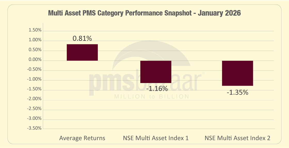 Multi-asset PMS strategies again stood out in January 2026, delivering positive average returns despite a weak month for risk assets. Across 33 schemes tracked, the category posted an average return of 0.81%. That is notable because both reference indices in this bucket were negative: NSE Multi Asset Index 1 fell 1.16% and NSE Multi Asset Index 2 declined 1.35%. On outperformance counts, 22 of 33 schemes finished ahead of Index 1, and 25 of 33 beat Index 2, indicating that a clear majority stayed ahead of their stated yardsticks even as broader market conditions deteriorated.