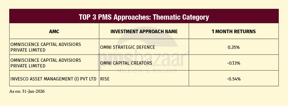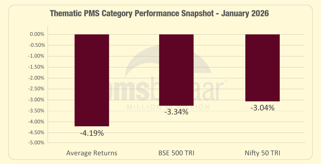 Thematic PMS strategies had a tough January 2026, with the category registering a sharper drawdown than the broader indices. Across 23 schemes tracked, the segment posted an average return of -4.19%, worse than the S&P BSE 500 TRI (-3.34%) and the Nifty 50 TRI (-3.04%). Consistent with that, outperformance was limited: only 9 of 23 strategies beat the BSE 500 TRI and 8 finished ahead of the Nifty 50 TRI. This shows that this bucket, by design narrower in exposure, struggled to keep pace in a risk-off month.