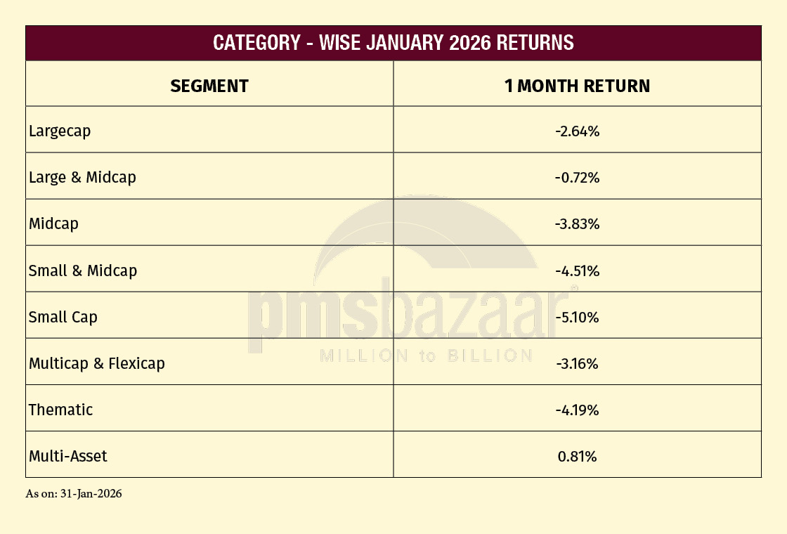 January 2026’s category-wise PMS returns sharpen the gap between diversified mandates and most equity-heavy styles. Multi-Asset was again the only segment with a positive average return, at 0.81%, standing out in a month when headline indices fell over 3%. Among equity categories, Large & Midcap was the most resilient at -0.72%, indicating that blended exposure held up relatively better than more style-specific buckets.