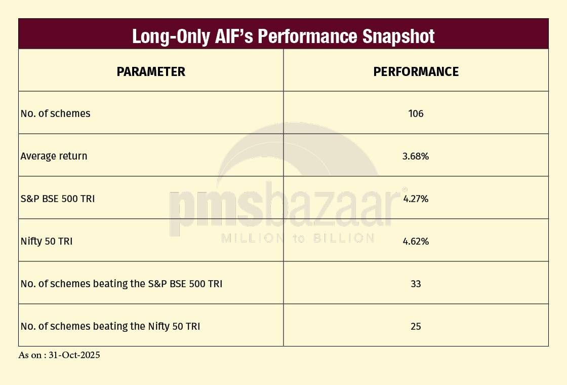 On a relative basis, long-short AIFs underperformed long-only AIFs by 98 basis points in October, which is a reversal of September’s dynamic. However, this underperformance aligns with expectations for hedged strategies in months dominated by strong beta and sectoral breadth. Despite this, long-short funds continue to provide valuable risk-adjusted stability: lower drawdowns, reduced volatility and more consistent return pathways across cycles.