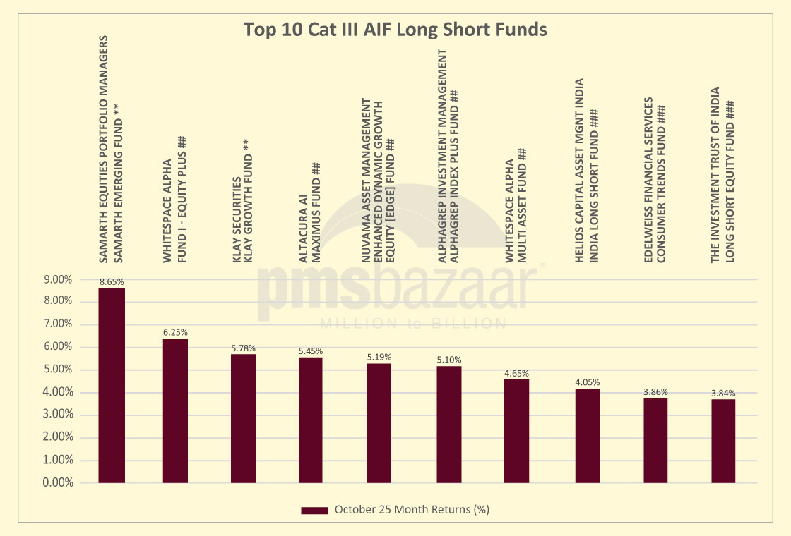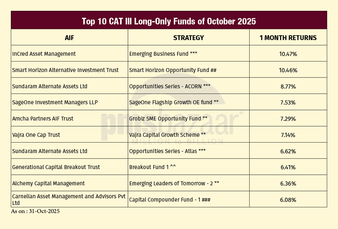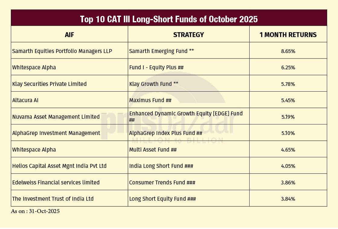 Category III long-short Alternative Investment Funds delivered a steady but somewhat moderated performance in October 2025, navigating a sharply rebounding equity market characterised by elevated volatility and renewed foreign inflows. The category’s average return of 2.7 per cent lagged the headline benchmarks—4.62 per cent for the Nifty 50 TRI and 4.27 per cent for the S&P BSE 500 TRI—but continued to demonstrate the segment’s ability to produce more controlled drawdown profiles and smoother return arcs across turbulent periods.