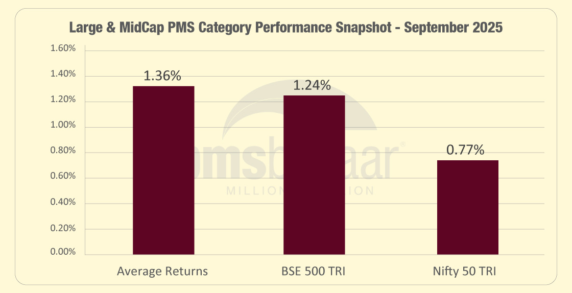 Large & Midcap PMS strategies delivered a solid month in September 2025, extending their relative strength seen through the quarter. The category posted an average return of 1.36 percent, comfortably ahead of both the BSE 500 TRI (1.24 percent) and the Nifty 50 TRI (0.77 percent). Out of 22 schemes tracked, 12 outperformed the BSE 500 TRI, while 15 beat the Nifty 50 TRI, reflecting broad participation across the segment.