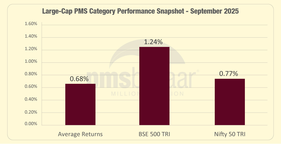 Large-cap PMS strategies posted muted yet steady gains in September 2025. The category registered an average return of 0.68 per cent, trailing the BSE 500 TRI’s 1.24 percent and slightly below the Nifty 50 TRI’s 0.77 percent. Out of 28 schemes tracked, only seven outperformed the BSE 500 TRI, while nine beat the Nifty 50 TRI, showing that performance dispersion remained narrow within this relatively stable segment.