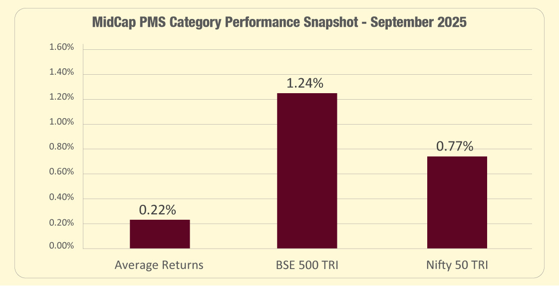 The MidCap PMS segment posted average returns of 0.22% in September 2025, significantly below the BSE 500 TRI (1.24%) and Nifty 50 TRI (0.77%).This underperformance reflects the higher volatility and sensitivity of mid-cap stocks in a fluctuating market environment.