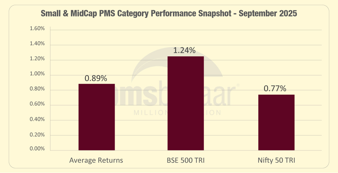 After two months of weakness, Small & Midcap PMS strategies bounced back in September 2025 with a clear show of strength. The category posted an average return of 0.89 percent, slightly trailing the BSE 500 TRI (1.24 percent) but ahead of the Nifty 50 TRI (0.77 percent). Out of 54 schemes tracked, 23 outperformed the BSE 500 TRI, and 26 beat the Nifty 50 TRI, underscoring selective resilience in the broader mid-market space.
