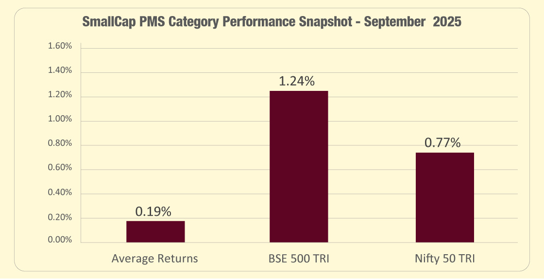 The Small Cap PMS segment delivered average returns of 0.19% in September 2025, trailing both the BSE 500 TRI (1.24%) and Nifty 50 TRI (0.77%).This highlights the high volatility inherent in small-cap stocks, emphasizing the potential for long-term gains despite short-term underperformance.