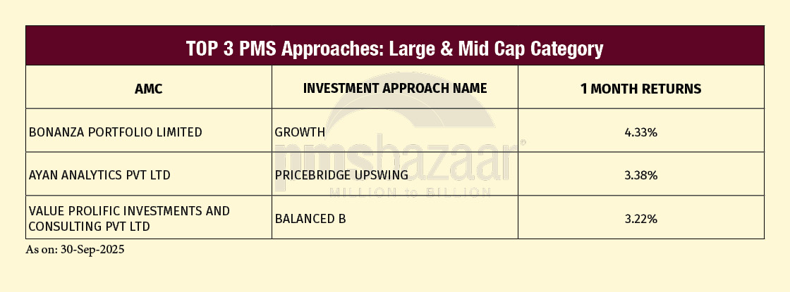 Small & Midcap PMS funds also made a notable comeback, posting 0.89 percent, signalling that investors were willing to re-enter broader market segments after August’s steep drawdowns. Multicap & Flexicap portfolios averaged 0.73 percent, while Large-Cap strategies added 0.68 percent, highlighting consistent yet moderate participation across equity tiers.