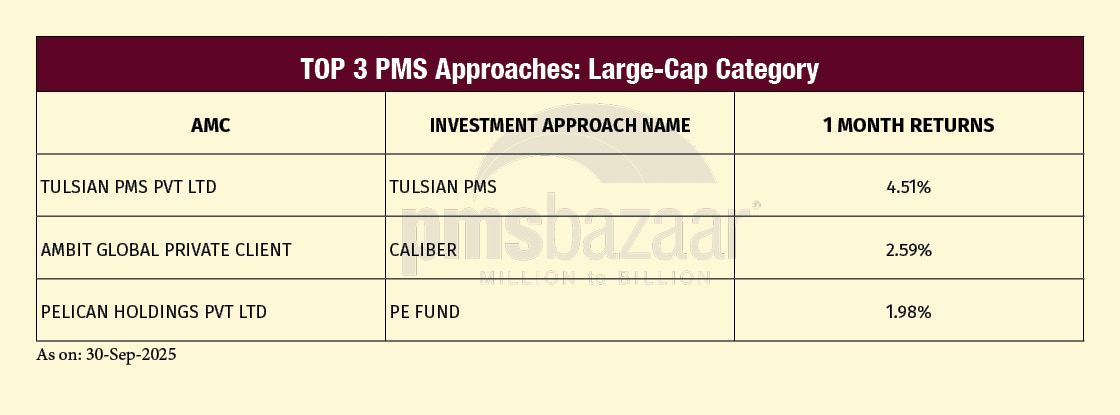 The Large Cap PMS segment delivered average returns of 0.68% in September 2025, underperforming both the BSE 500 TRI (1.24%) and Nifty 50 TRI (0.77%). This reflects a conservative positioning within large-cap stocks, prioritizing stability and risk management amid market fluctuations.