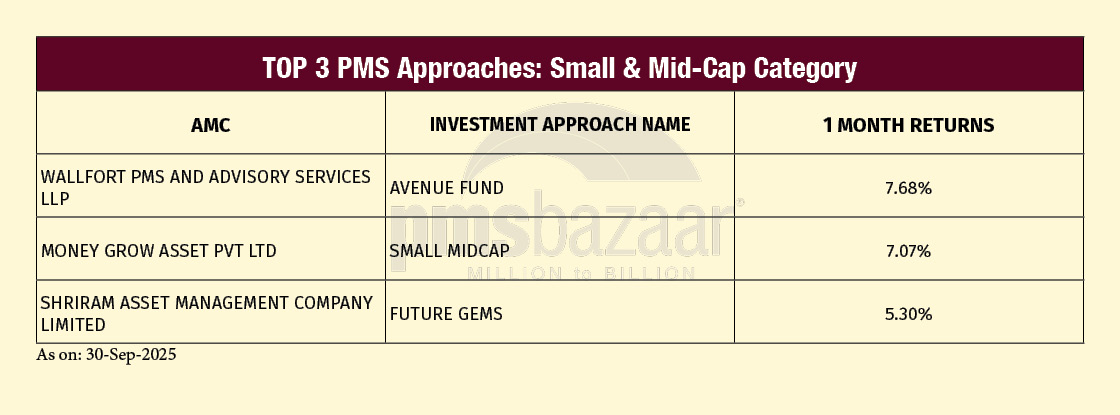 Wallfort PMS’s Avenue Fund led from the front with a stellar 7.68 percent gain, the highest within the category. Money Grow Asset’s Small Midcap followed closely at 7.07 percent, maintaining strong momentum through the month. While Shriram AMC’s Future GEMS posted 5.30 percent.