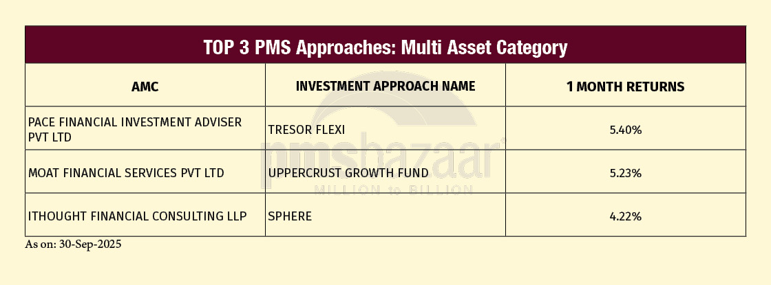 Multi-Asset PMS strategies continued their strong run in September 2025, emerging as the best-performing category for the month. Out of 23 schemes tracked, 14 outperformed the NSE Multi Asset Index 1 and 20 beat Index 2, highlighting the consistency of returns across managers. The category’s average return stood at 2.05 percent, well ahead of both benchmarks --- 1.53 percent and 1.56 percent respectively.