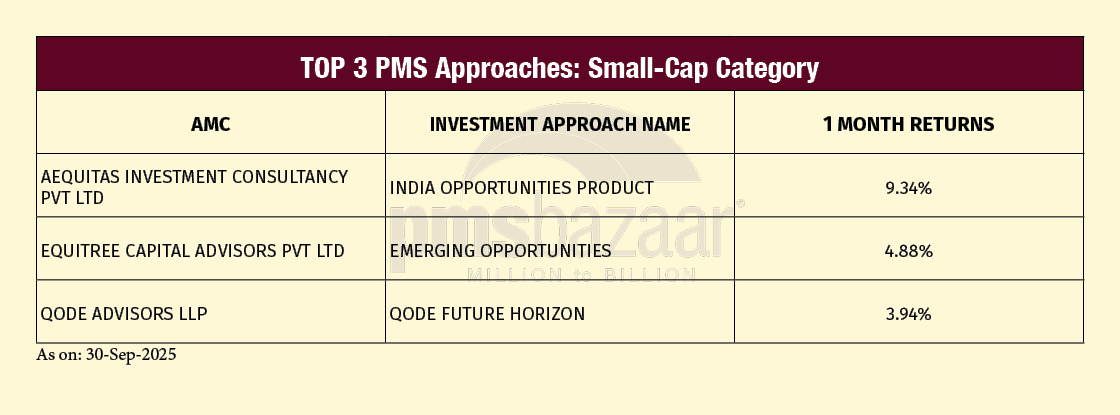 Small-cap PMS strategies posted a mixed performance in September 2025, though a few standout performers lifted overall sentiment. The category recorded an average return of 0.19 percent, trailing both the BSE 500 TRI’s 1.24 percent and the Nifty 50 TRI’s 0.77 percent. Out of 28 schemes tracked, five outperformed the BSE 500 TRI and seven beat the Nifty 50 TRI, signalling that select, high-conviction portfolios drove most of the gains.