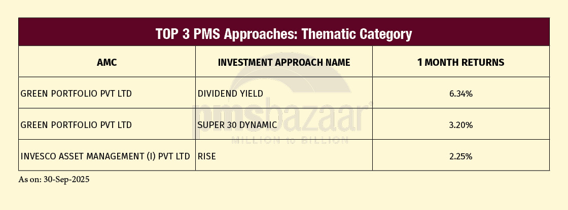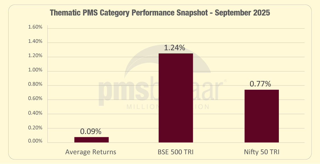 The Thematic PMS segment posted average returns of 0.09% in September 2025, underperforming both the BSE 500 TRI (1.24%) and Nifty 50 TRI (0.77%). This reflects the concentrated nature of thematic strategies, which can experience short-term volatility while targeting specific high-growth themes for long-term potential.