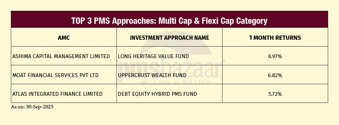 Among diversified approaches, Ashima Capital’s Long Heritage Value Fund added 6.97 percent, while Moat Financial Services’ UpperCrust Wealth Fund delivered 6.82 percent, both drawing attention in the multi-cap and flexi-cap category. Together, these five accounted for the sharpest advances across PMS strategies in September, outpacing both the Nifty 50 TRI and the BSE 500 TRI by wide margins.