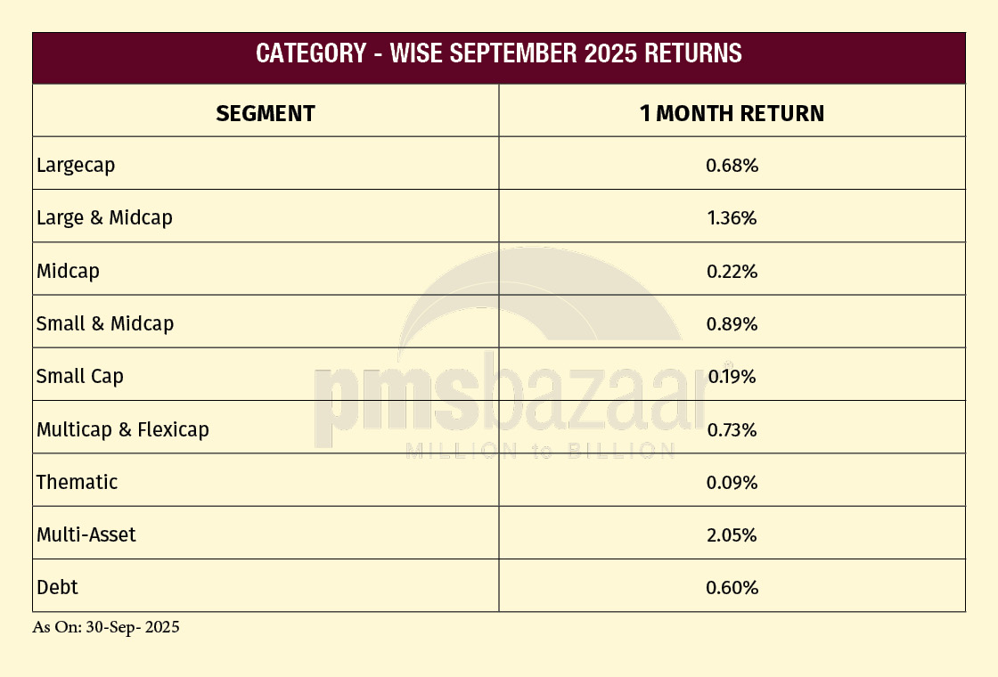 As you can see, the Large & Midcap category continued to demonstrate stability and consistent alpha generation. September’s performance reaffirmed investor preference for balanced exposure, where combination of the growth potential of midcaps with the relative safety of largecaps brought investor delight.