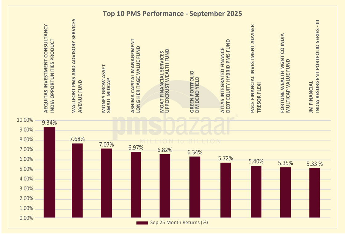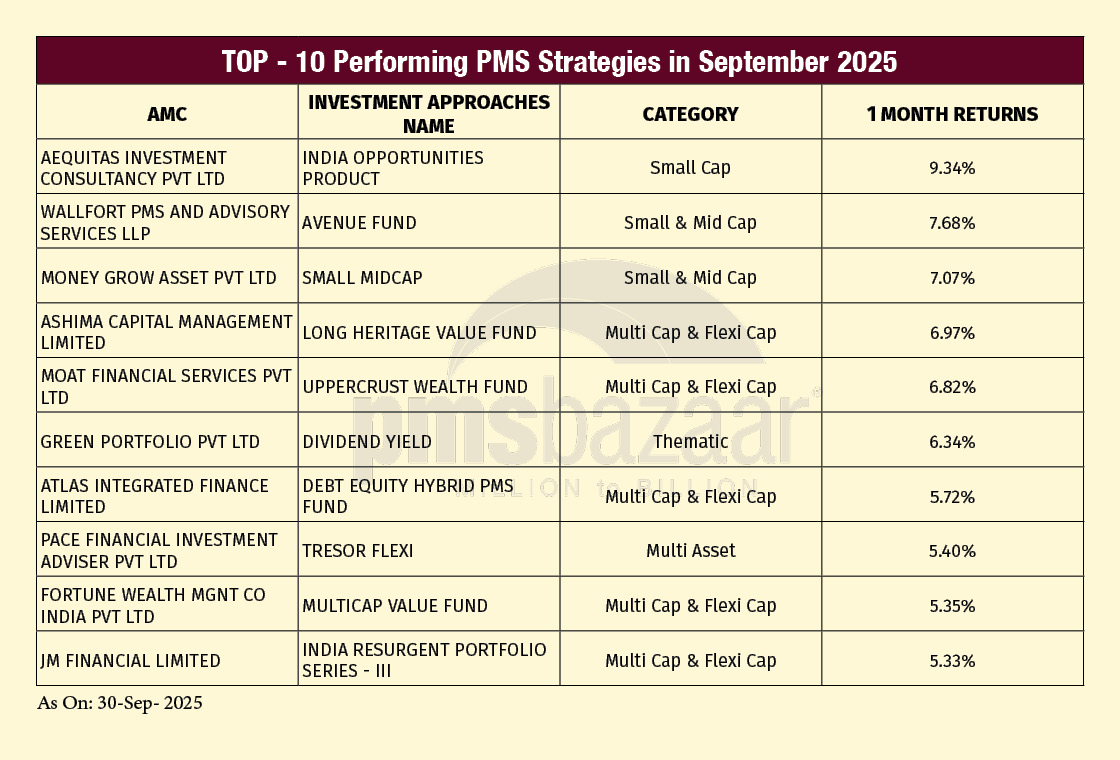Aequitas Investment Consultancy’s India Opportunities led the overall performance chart with an impressive 9.34 percent gain. The small-cap strategy was the clear outlier in a market where most peers posted mid-single-digit returns. Close behind, Wallfort PMS’s Avenue Fund advanced 7.68 percent, continuing its steady showing within the small- and mid-cap segment. Money Grow Asset’s Small Midcap strategy followed closely at 7.07 percent, rounding off a trio of strong performers in the broader mid-market universe.